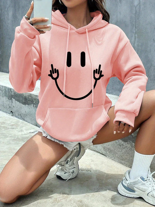 Women’s Graphic Pullover Hoodie – Long Sleeve With Smiley Face Print and Kangaroo Pocket for Fall Layering
