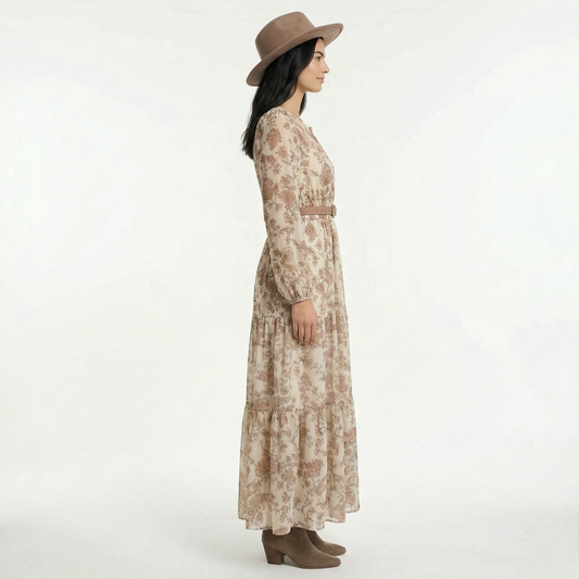 Sky Coconut Floral Maxi Dress - V-Neck, Smocked Waist, Sheer Long Sleeves