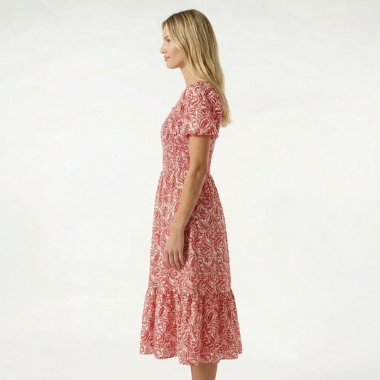 Red Printed Midi Dress - Smocked Bodice, Round Neck, Short Sleeve