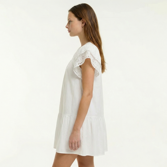 Off White Eyelet Woven Dress - Ruffle Sleeve, Breezy Cotton, Side Pockets