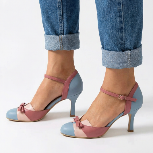 Stiletto Heel Sandals - Closed Round Toe, Buckled Ankle Strap, Mid Heel