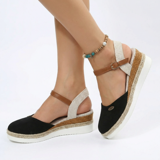 Platform Espadrille Sandals - Closed-Toe Front, Braided Jute Trim, Ankle Strap