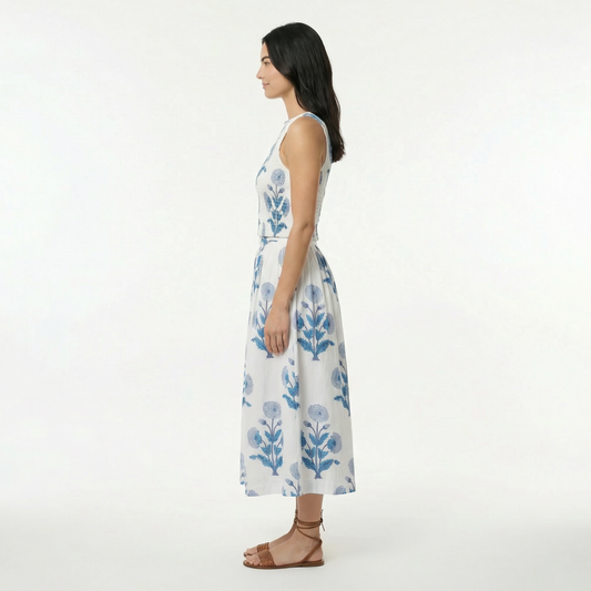 White Blue Floral Two-Piece Set - Smocked Fitted Top, Boatneck, Keyhole Back