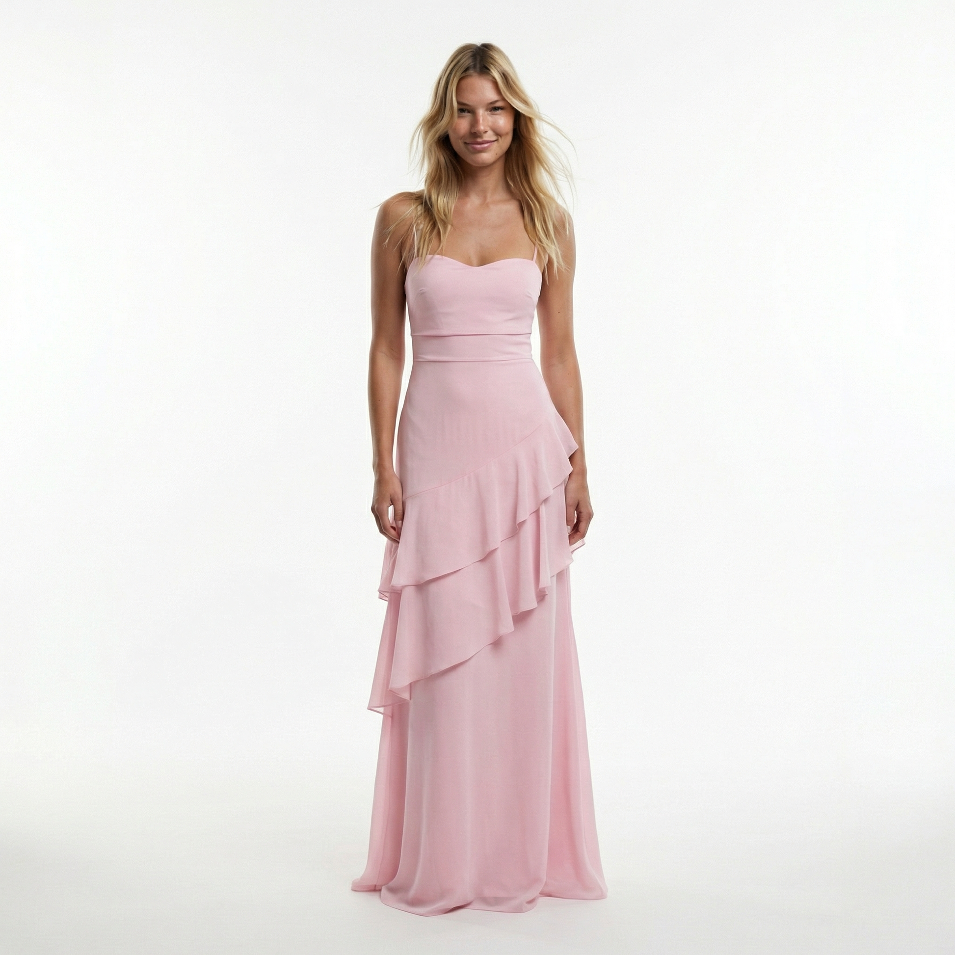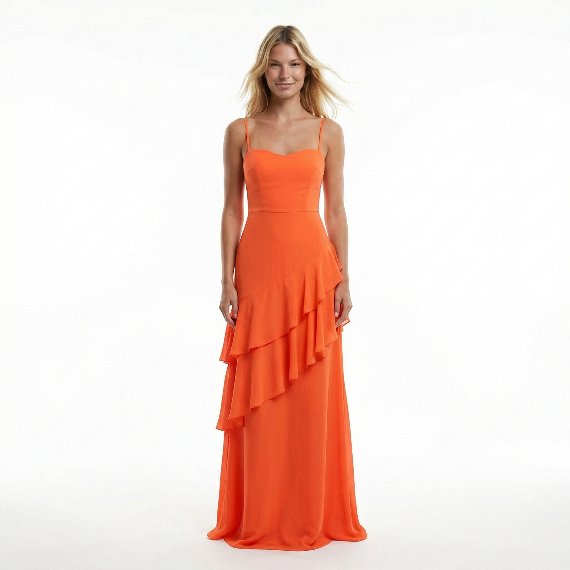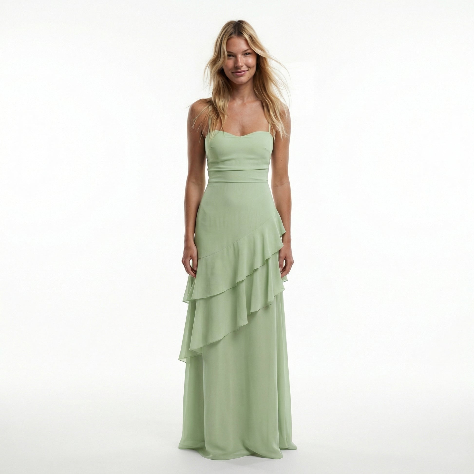 This chiffon prom dress creates a graceful, confidence-boosting silhouette with its sleek sheath shape and soft ruffle detailing. The lightweight fabric moves beautifully as you walk, while the delicate straps and open lace-up back add a refined, modern touch that feels special from every angle.