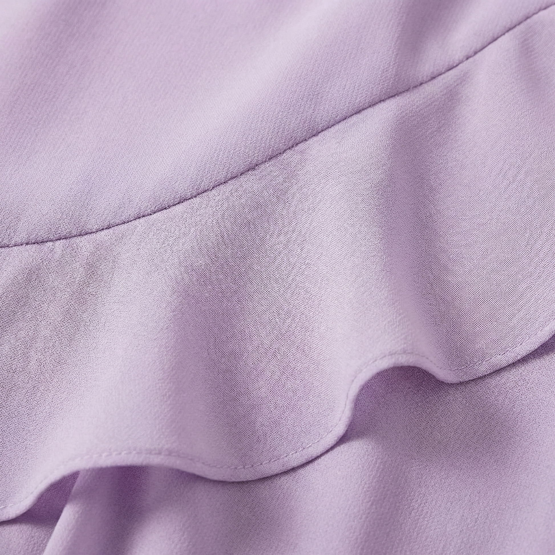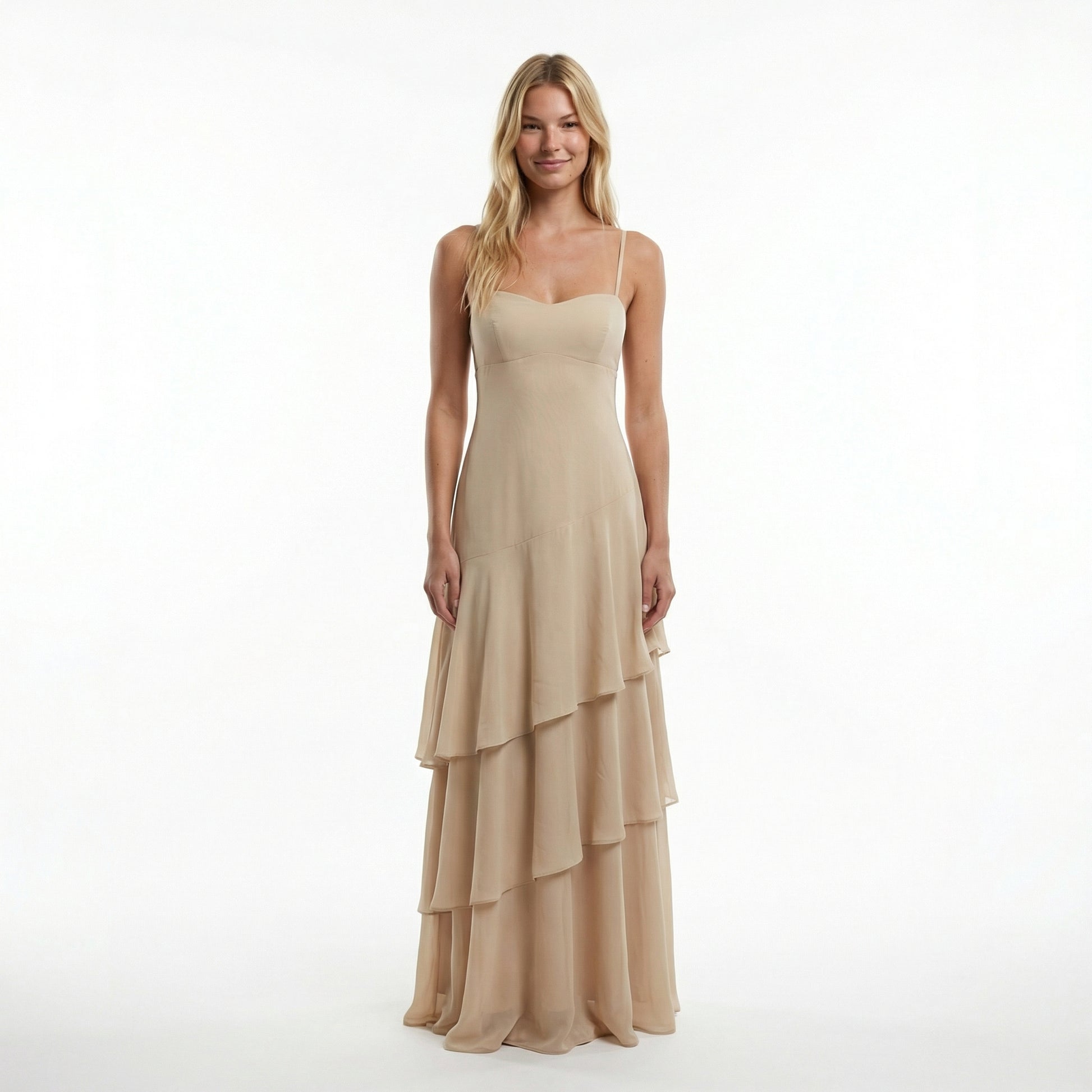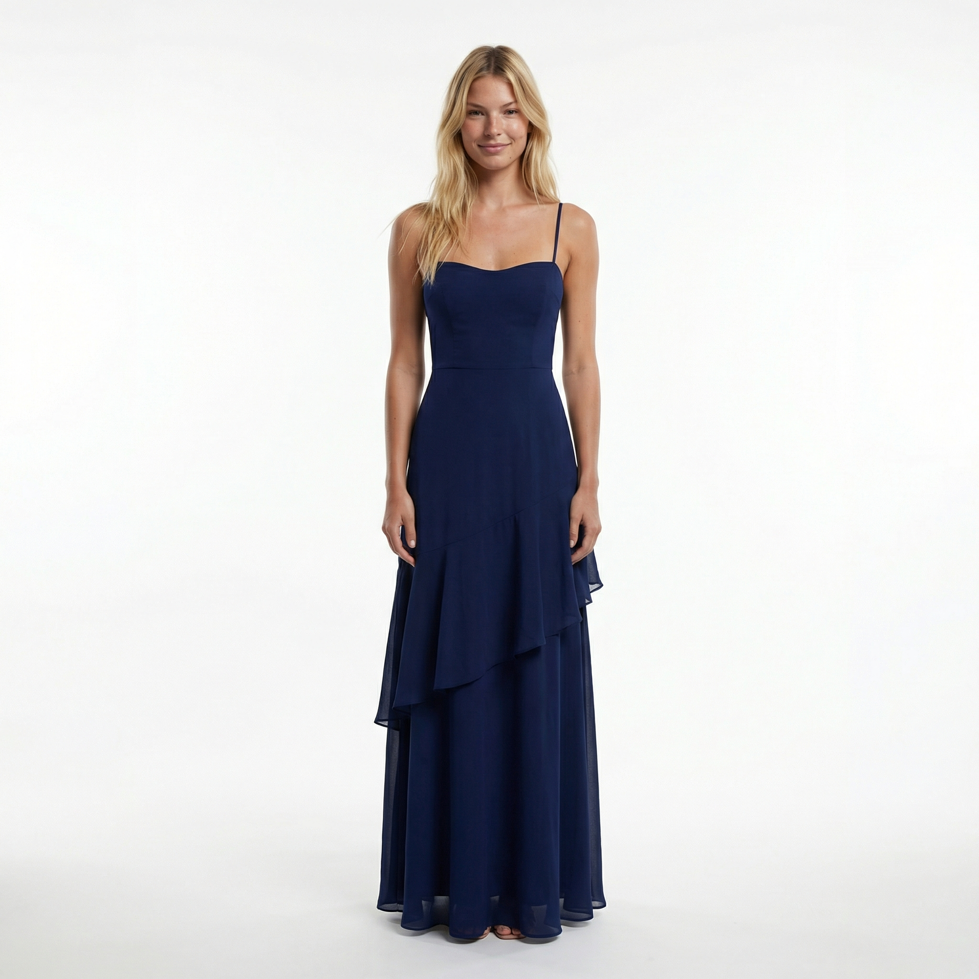 This chiffon prom dress creates a graceful, confidence-boosting silhouette with its sleek sheath shape and soft ruffle detailing. The lightweight fabric moves beautifully as you walk, while the delicate straps and open lace-up back add a refined, modern touch that feels special from every angle.