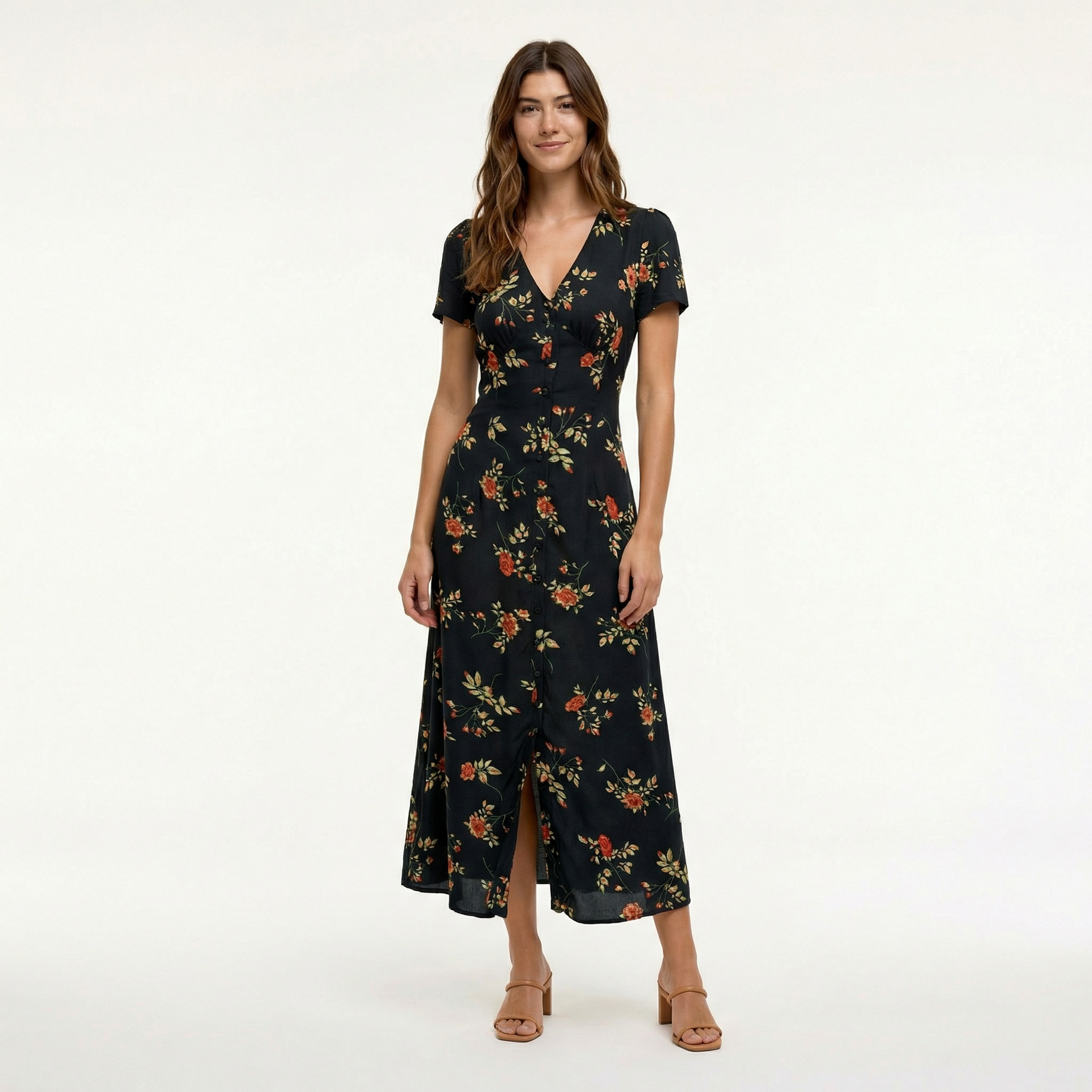 This black floral maxi dress is designed to move with you, offering a relaxed sense of elegance without feeling overdressed. The V-neckline and short sleeves keep the look light and wearable, while the flowing length creates a timeless silhouette you can rely on again and again.