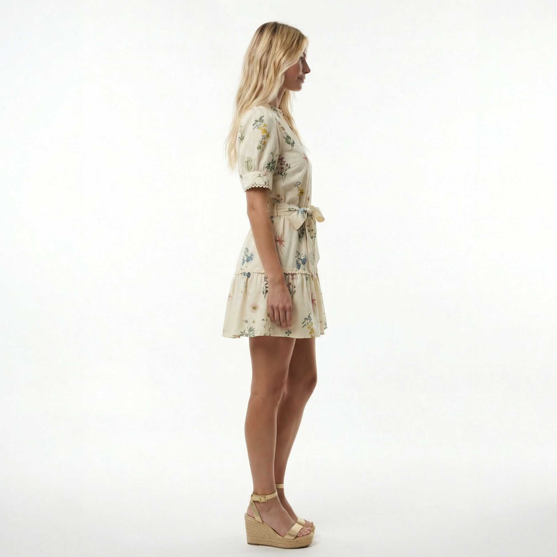 Cream Floral Cotton Mini Dress - Waist Tie, Scalloped Lace Trim, Side Pockets